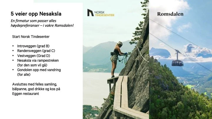 5 veier opp Nesaksla er en variert og fleksibel aktivitet hvor deltakerne kan velge mellom flere ulike ruter til toppen – tilpasset både nivå og ambisjonsnivå. Her kombineres fysisk aktivitet, mestring og spektakulær utsikt, enten man velger Via Ferrata, fottur eller gondol som en del av opplevelsen. Opplevelsen rundes av med en felles samling på toppen av Nesaksla, med bålpanne, god mat og kos.